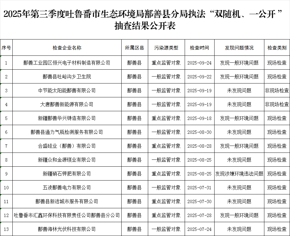 2025年第三季度吐魯番市生態(tài)環(huán)境局鄯善縣分局執(zhí)法“雙隨機、一公開 ”抽查結(jié)果公開表