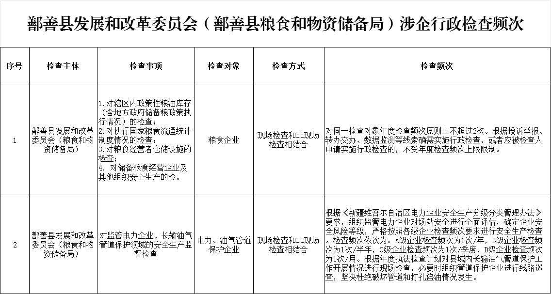 鄯善縣發展和改革委員會(鄯善縣糧食和物資儲備局)涉企行政檢查頻次